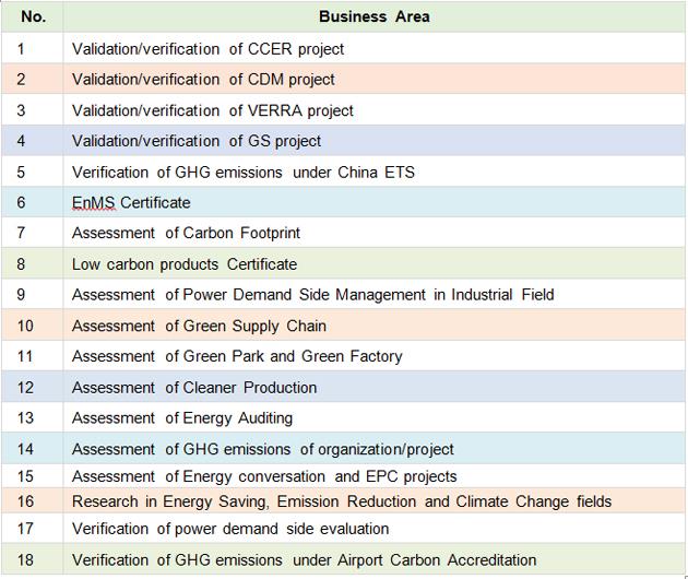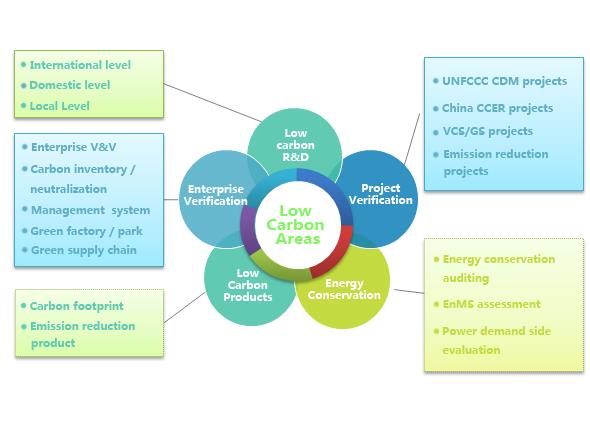 CEC has five major business sectors in low carbon areas: verification and certification of GHG emission reductions at project level, verification and certification of GHG emission reductions in supply chain and low carbon products, verification of GHG emissions at enterprise level; energy conversation auditing and research on low-carbon subjects.